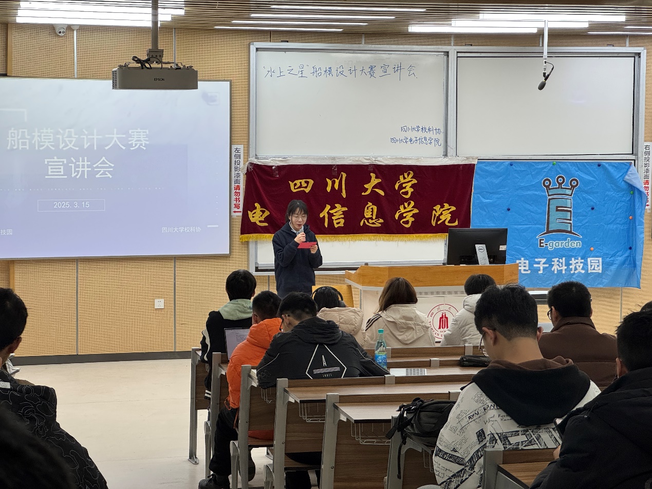 2025年3月15日晚19点20分,bat365在线体育登录电子科技园开展的“水上之星”船模设计大赛宣讲会在四川大学江安校区综合楼C座C204顺利举行。电子科技园的学长学姐、往届获奖学长及想要参赛的同学参加此次大会。