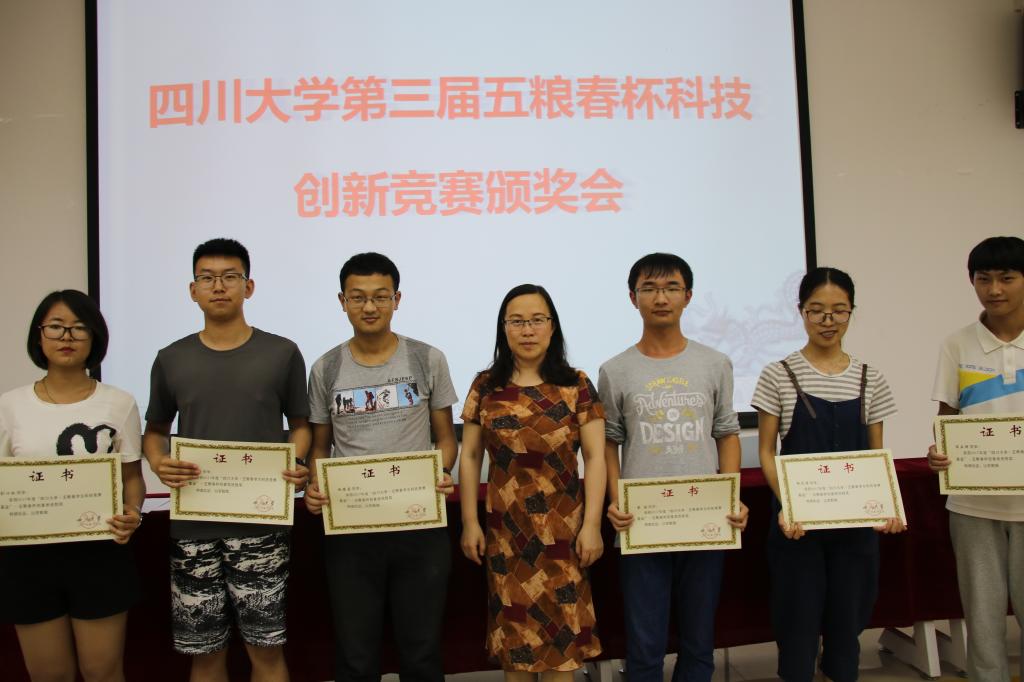 本次活动的主持人由李运国老师担任,会议开始,全体起立,高唱国歌。随后冯国英院长宣读本届“五粮春杯”获奖名单。宣读完毕之后,比赛特等奖获得者王洁同学代表全体获奖同学发言。她对自己能获得此项殊荣感到十分自豪,并对赞助“五粮春杯”科技竞赛的成都宏川酒业有限公司和学院的老师及领导表达了自己的感激之情,感谢他们提供给同学们一个可以绽放自己的平台。她还说自己会再接再励,以取得更好的成绩来回报学校学院对自己的培养之恩,并祝成都宏川酒业有限公司越办越好。王洁同学发言过后,是冯国英院长上台致辞。她首先感谢了成都宏川酒业有限公司为学院学子提供了这样一个展示自我,提升实践创新能力的平台,表扬了在此次比赛中获奖的同学,肯定了同学在比赛中做出的努力。她希望可以有更多同学能参与到“五粮春杯”等一系列的比赛中来,在比赛锻炼自己,在比赛中突破自己,成为社会中的精英人才。最后,冯国英院长为获奖同学颁奖,并和他们合影留念,四川大学第三届“五粮春杯”科技创新竞赛颁奖会圆满结束。