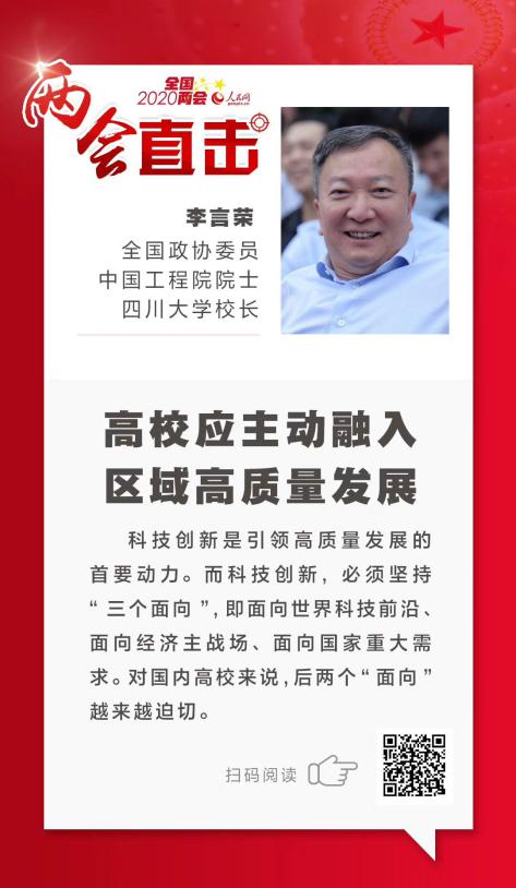 5月25日,人民网发布题为《全国政协委员李言荣:高校应主动融入区域高质量发展》的报道。李言荣提到,科技创新必须坚持“三个面向”,即面向世界科技前沿、面向国家重大需求、面向地方经济主战场。他认为,对国内高校来说,后两个“面向”越来越迫切。
